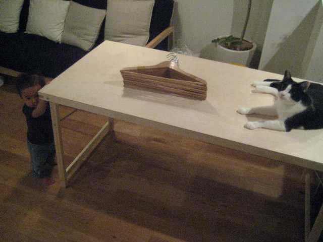 無塗装で木角材の骨組みに薄ベニヤの天板。
