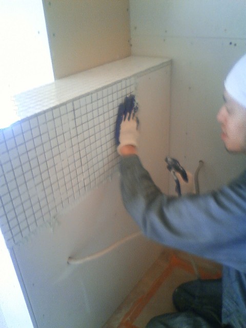 やはり水で溶くタイプの目地セメントをスポンジを使い