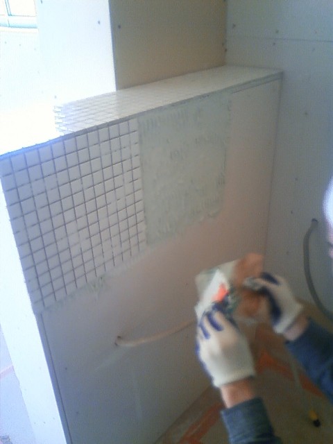 ドア枠や配水管の部分などはタイルを欠き込んでいきます。